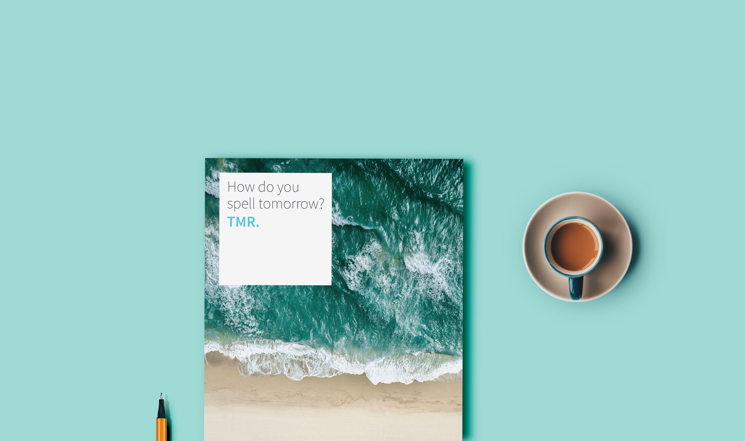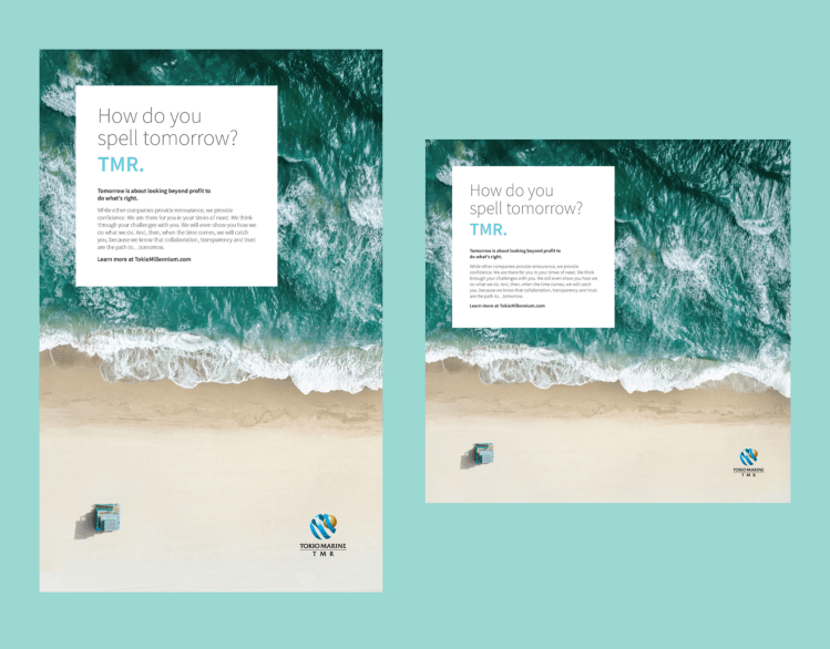 Tokio Millennium Re, an innovative, forward-looking reinsurer saddled with an awkward name and clunky identity was in dire need of a glow-up as it grew up. So we seized upon their industry acronym, TMR, recast it as modern, digital shorthand for tomorrow, and posed a playful question with a wink: How do you spell tomorrow? TMR.