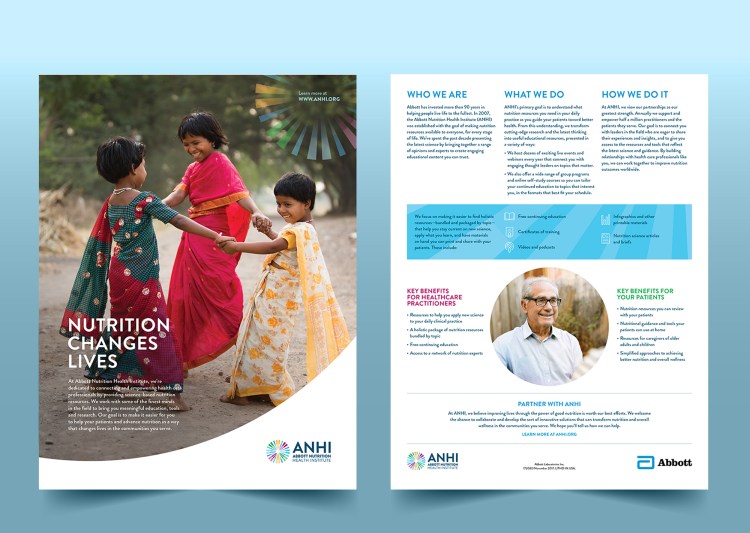 Abbott Nutrition Health Institute (ANHI) provides science-based, nutrition-focused educational resources to health care professionals (HCPs), many in emerging markets. However, the vertical was having an identity and awareness problem. After defining the what and the how, we created a new positioning and campaign concept with a simple and impactful idea that gets right to the why for HCPs: Nutrition Changes Lives.